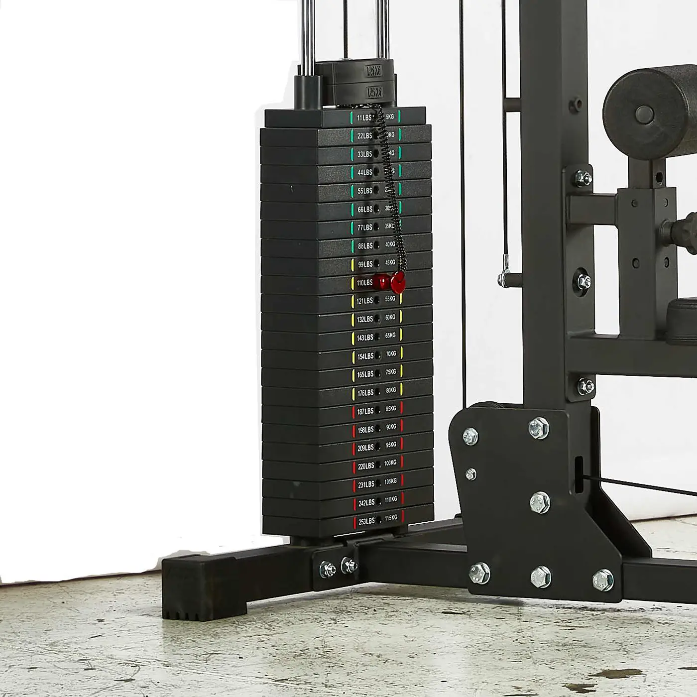 The plates go up in 5kg increments and can be changed with the supplied weight stack pin. The style and colour of the weight stack pin may vary – but they all function the same.